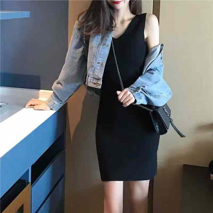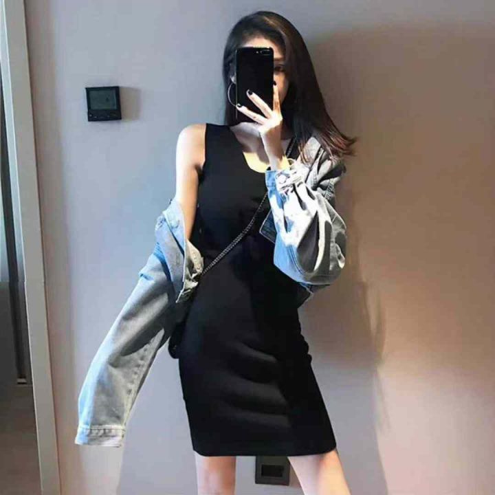 早秋新款法式纯欲性感辣妹弹力修身包臀黑色背心吊带针...