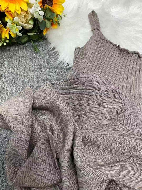 早秋新款奶乖甜极简复古港风开叉吊带针织连衣裙,独立...
