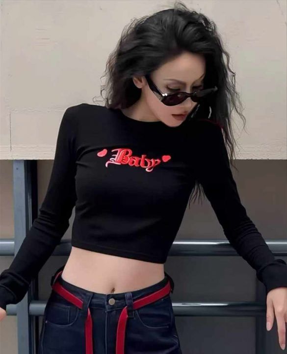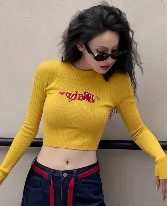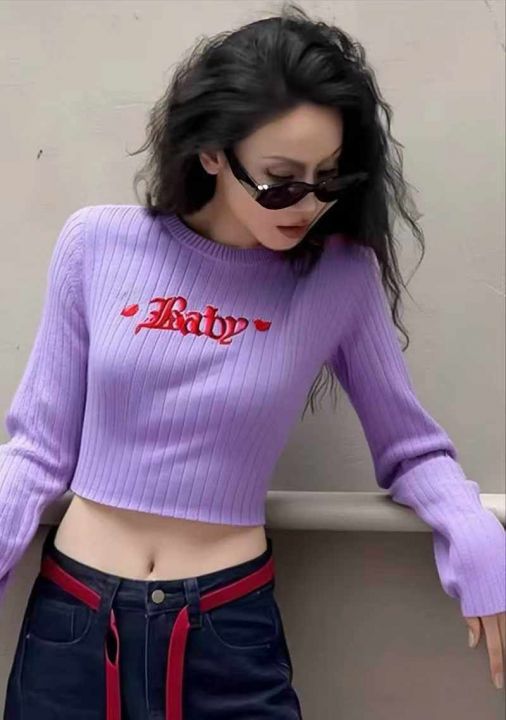 秋季新品纯欲甜辣短款字母刺绣针织长袖圆领套头毛衣,...