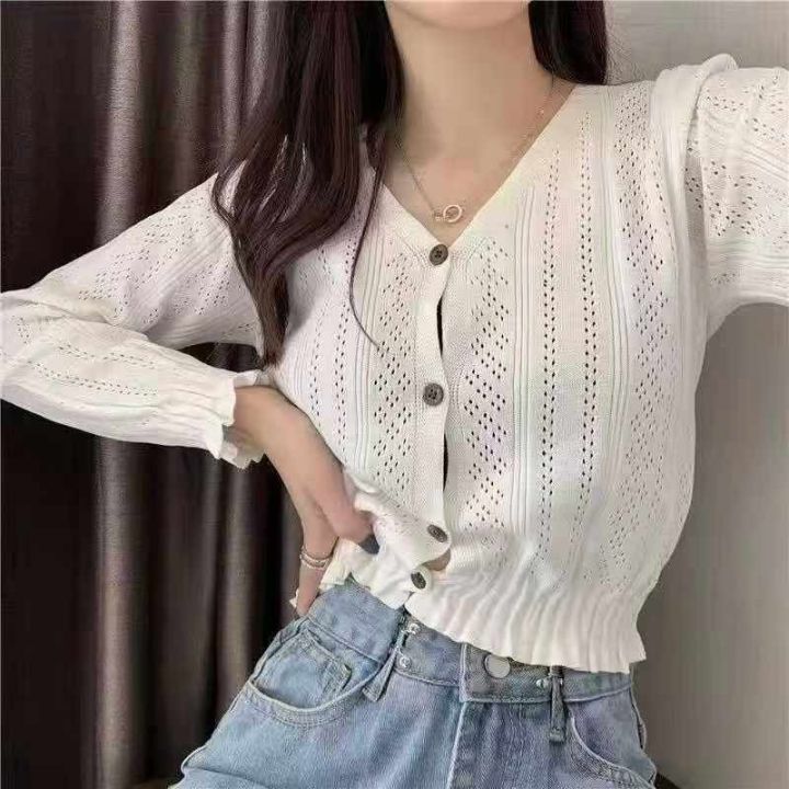 秋季新款木耳边设计款韩版V领镂空百搭长袖针织毛衣开衫,独立包装,单款多色,均码面料柔软舒适,1180件,全清6.9元超低价秒杀!分货加一!