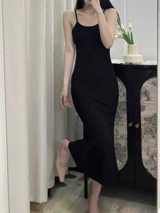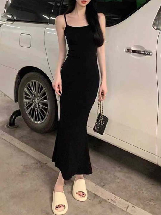 早秋新款性感辣妹弹力修身显瘦黑色包臀鱼尾吊带针织连...