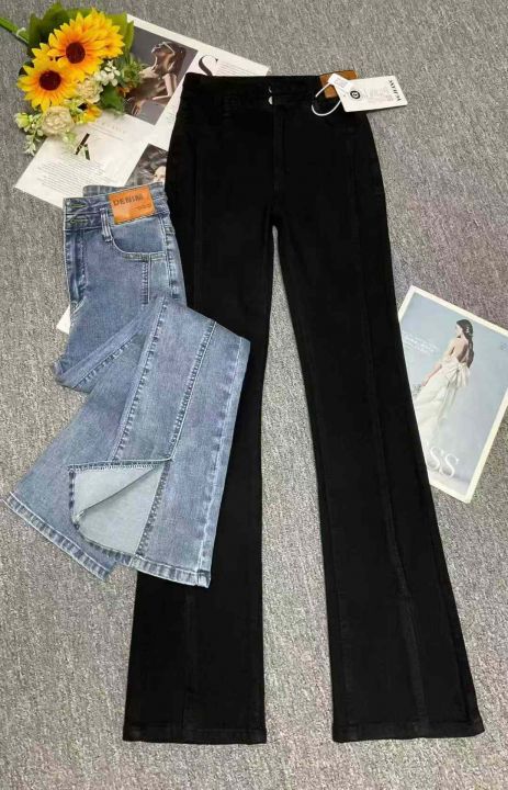 秋季新款高弹力洗水棉开叉高腰显瘦牛仔喇叭裤,独立包...
