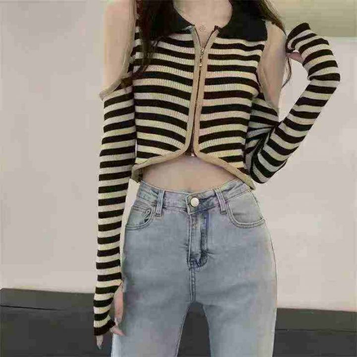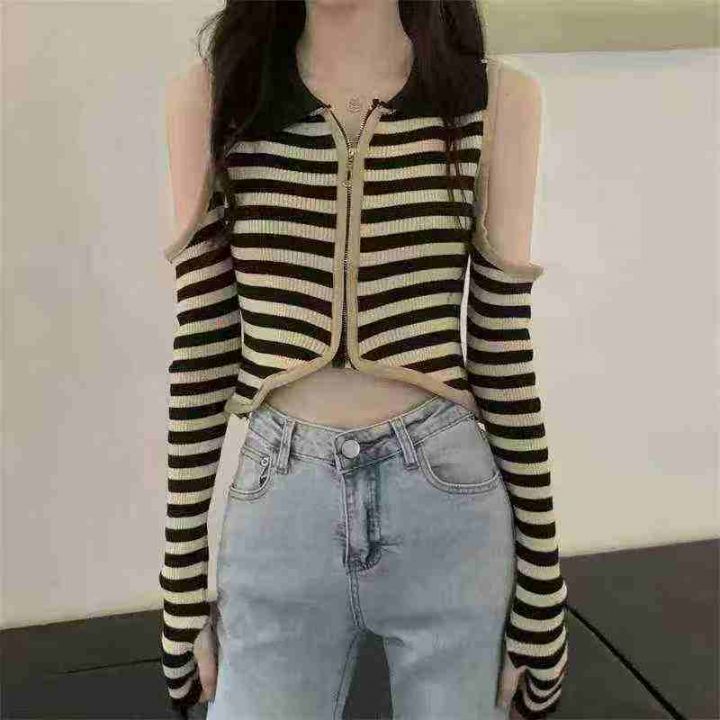 捡漏款,春秋季新款短款显瘦polo领纯欲风复古条纹露肩长袖针织开衫,独立包...