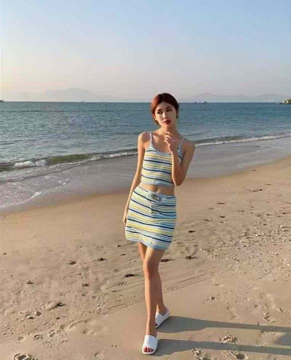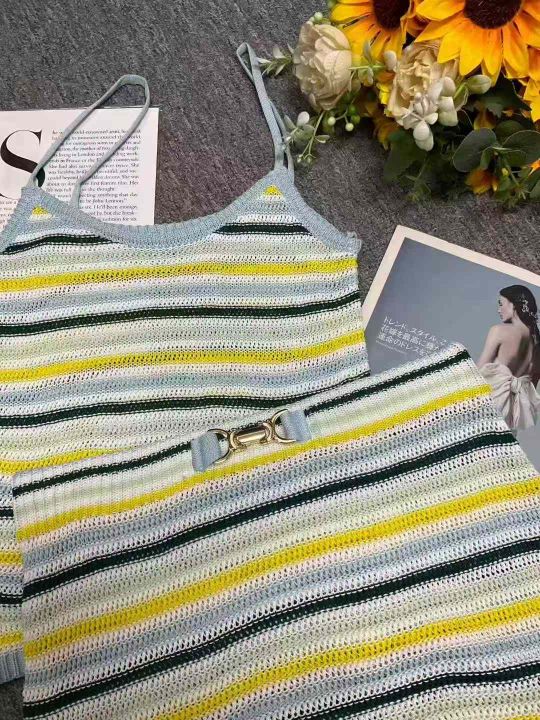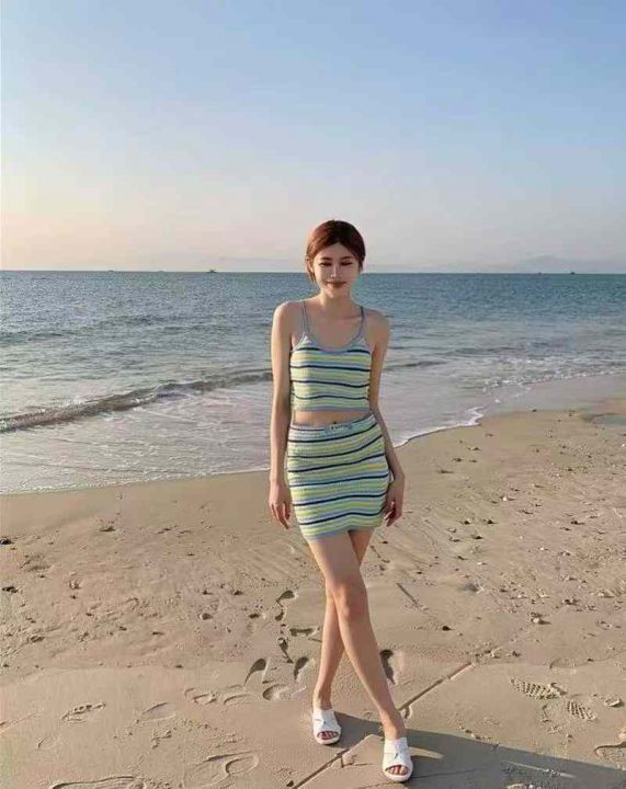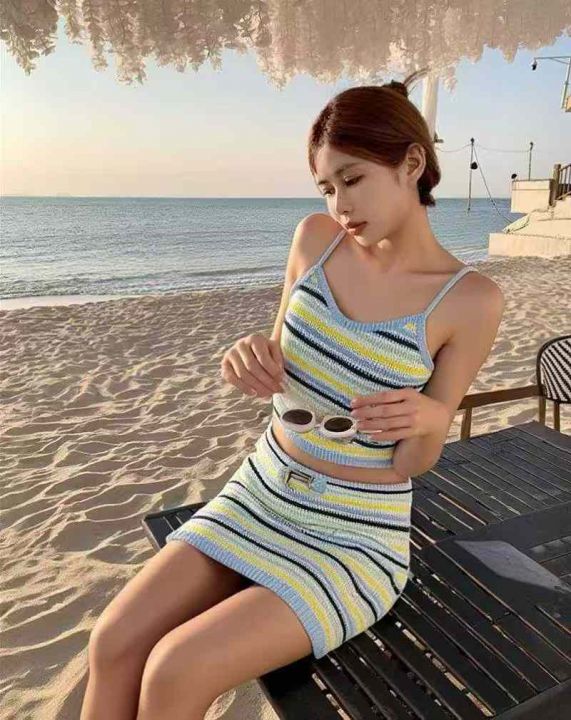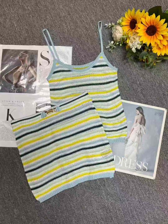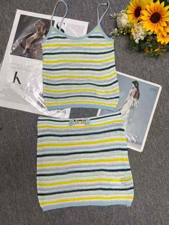 夏季新款辣妹性感撞色条纹针织背心+条纹针织短裙2件套...