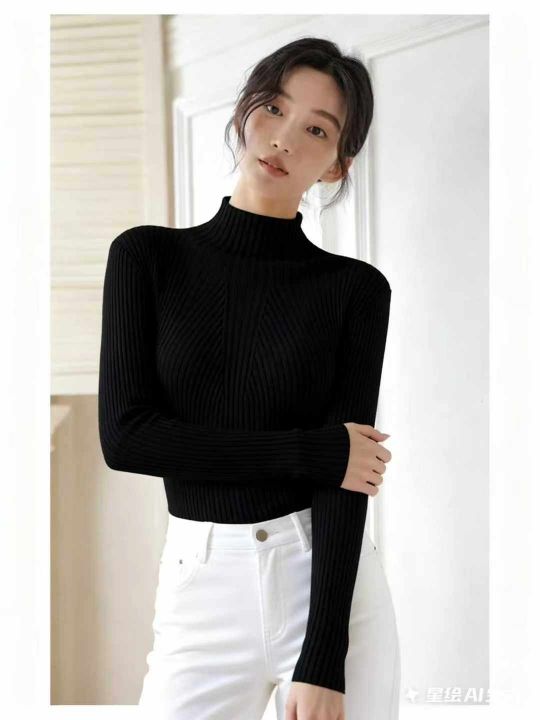 秋冬新款半高领弹力修身显瘦包芯纱套头毛衣,独立包装...