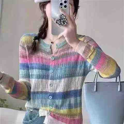 全清价6.5元捡漏62件春秋弹力设计感小众圆领彩虹拼接色条纹减龄开衫上衣,...