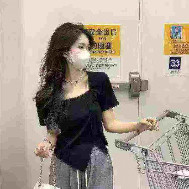 冰丝螺纹纯欲方领短袖t恤女2025夏季修身chic别致独特甜辣妹正肩短款上衣,1到6码,独立包装,货品干净,1000件左右,5.8清,分货加1