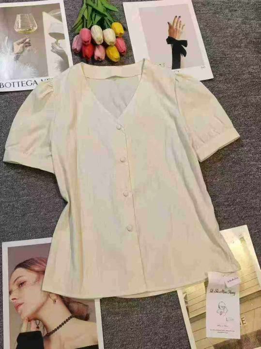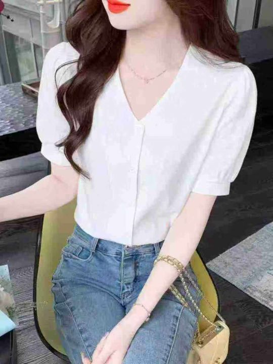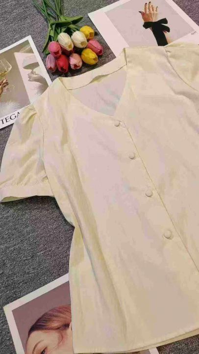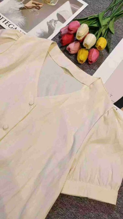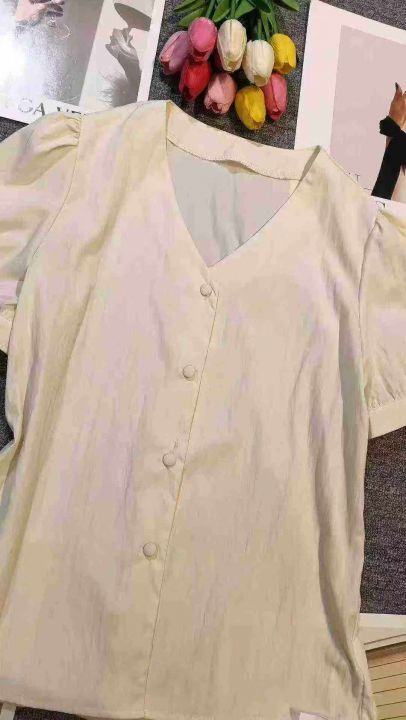 法式气质独特别致V领杏色泡泡袖上衣,[爱心]60件左右,款号#7049,码数M-2XL,穿80-140斤,万佳档口货,原包装️无瑕疵,(模特图仅供参考),[666]实体店品质