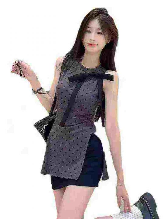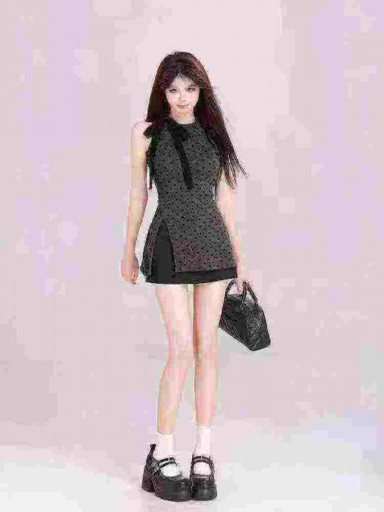 捡漏173件灰色波点时尚辣妹圆领无袖背心纯欲风蝴蝶结开叉不规则上衣,独立包装,码数1-4码,(货号920#68)