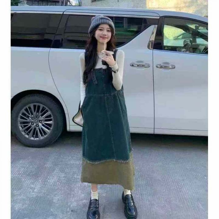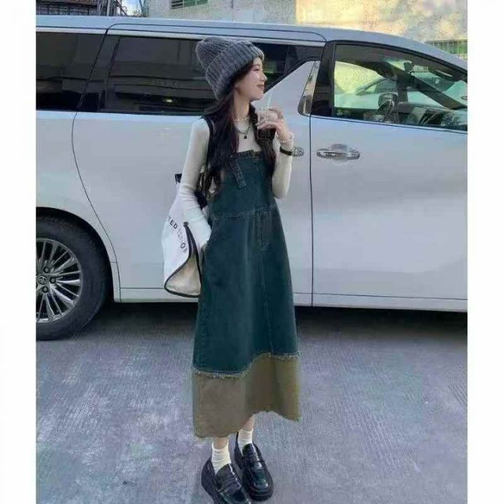 秋冬新款洋气复古拼接设计感宽松显瘦中长款背带牛仔连衣裙,独立包装带吊牌...
