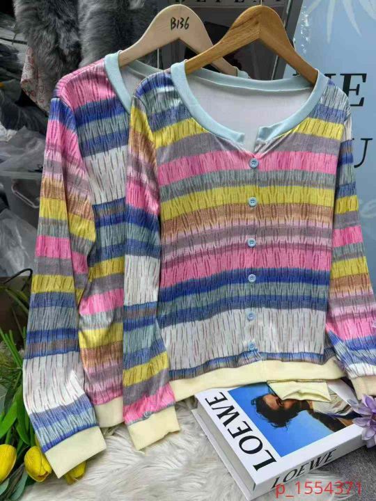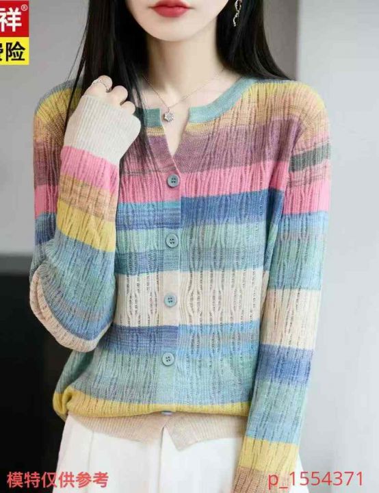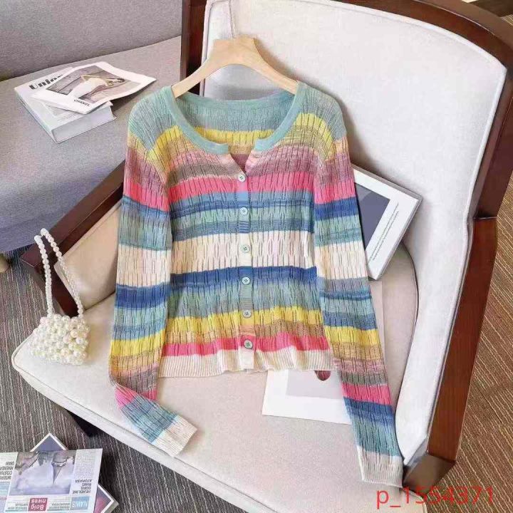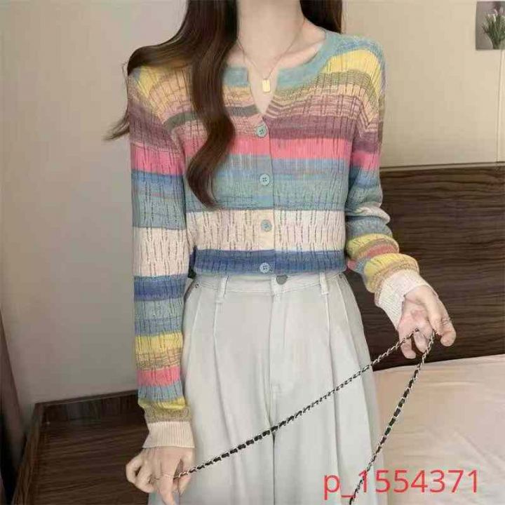 捡漏62件春秋弹力设计感小众圆领彩虹拼接色条纹减龄开衫上衣,独立包装,单款两色,图五色为主,码数2/4/6码,货号104#3 _@_@