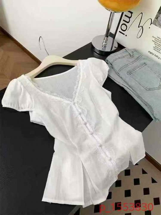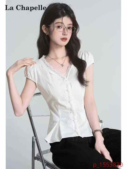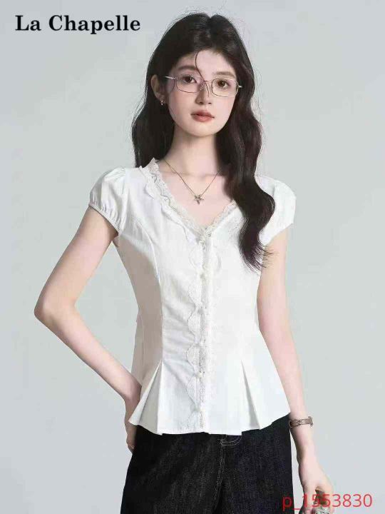 夏季法式蕾丝花边V领名媛风设计甜美收腰白色纯棉衬衫...