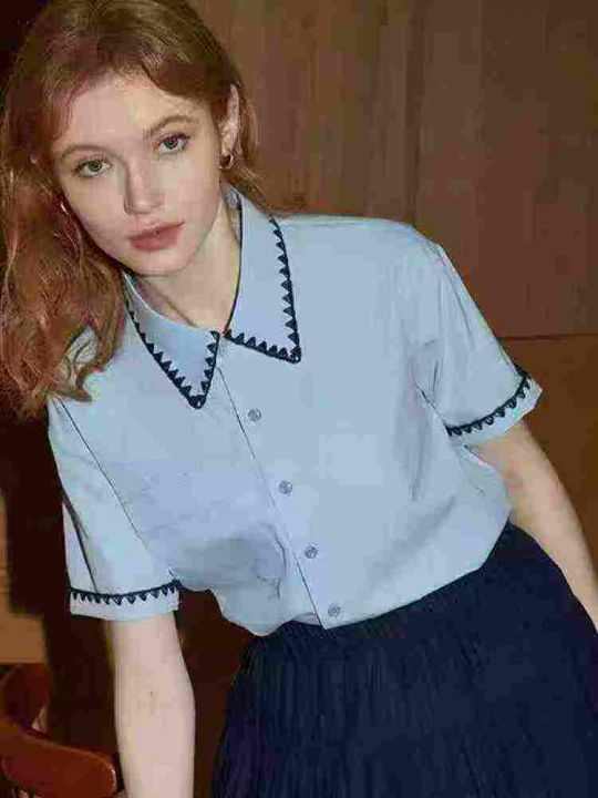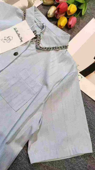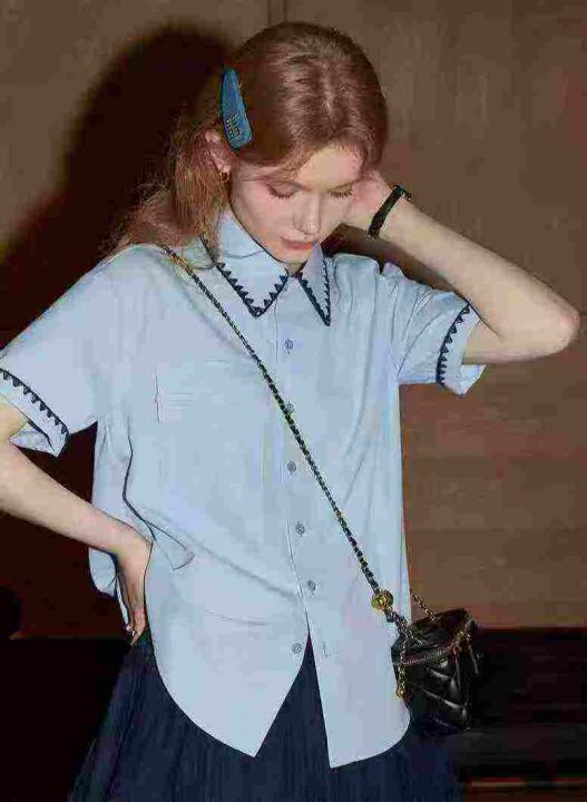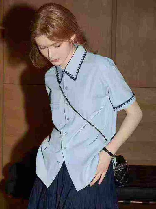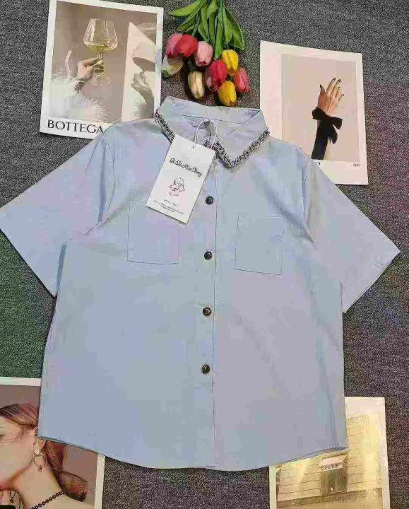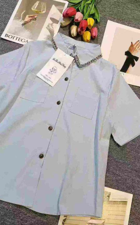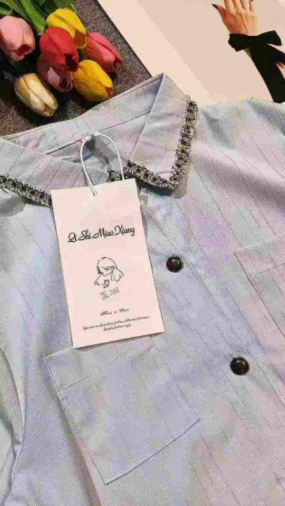 高级小香风翻领设计感蓝色衬衣,[爱心]55件左右,款号#7007,码数S-2XL,穿80-140斤,万佳档口货,原包装️无瑕疵,(模特图仅供参考),[666]实体店品质
