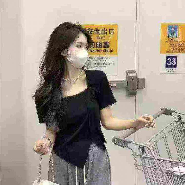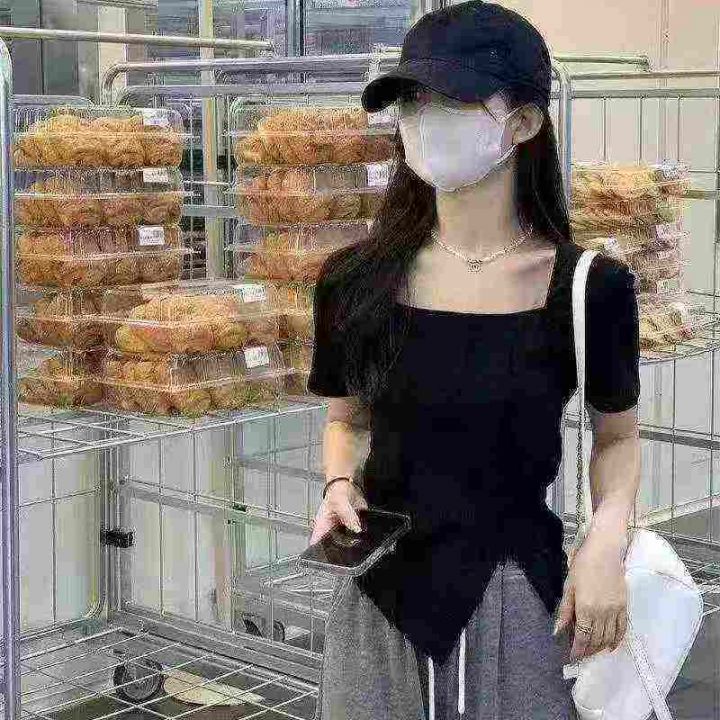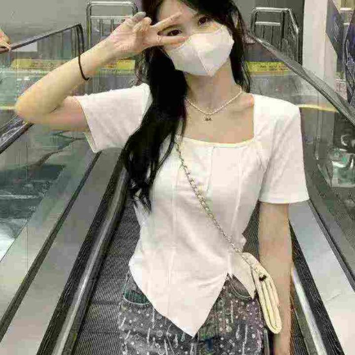 冰丝螺纹纯欲方领短袖t恤女2025夏季修身chic别致独特甜辣妹正肩短款上衣,1到6码,独立包装,货品干净,1000件左右,5.8清,分货加1