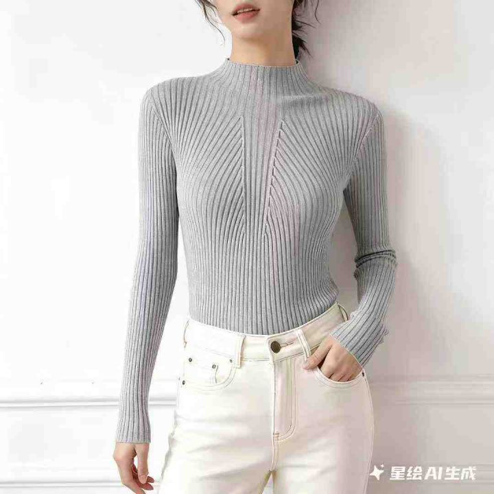 秋冬新款半高领弹力修身显瘦包芯纱套头毛衣,独立包装...