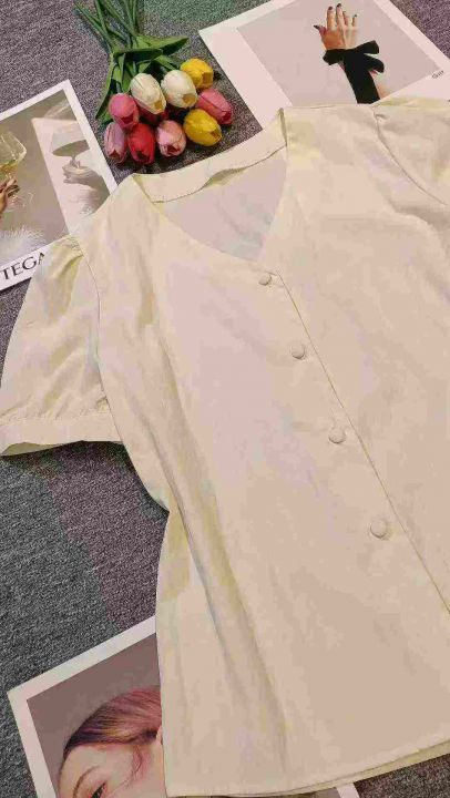 法式气质独特别致V领杏色泡泡袖上衣,[爱心]60件左右,款号#7049,码数M-2XL,穿80-140斤,万佳档口货,原包装️无瑕疵,(模特图仅供参考),[666]实体店品质