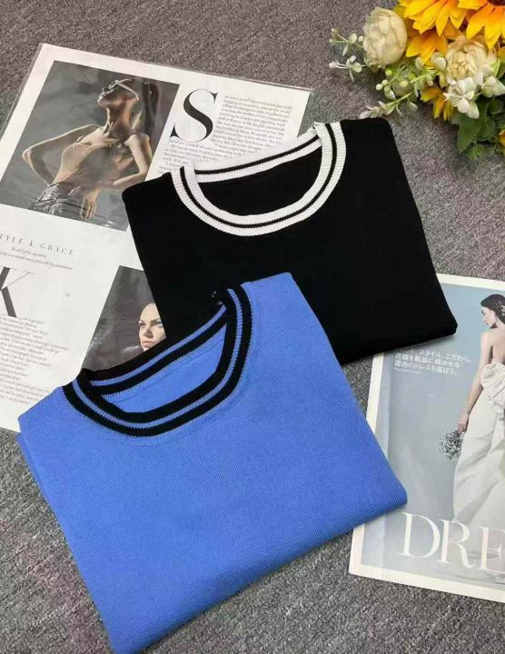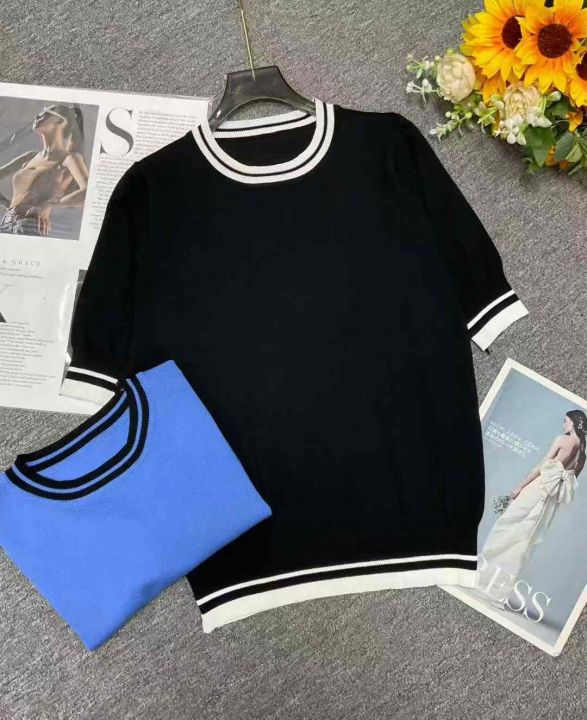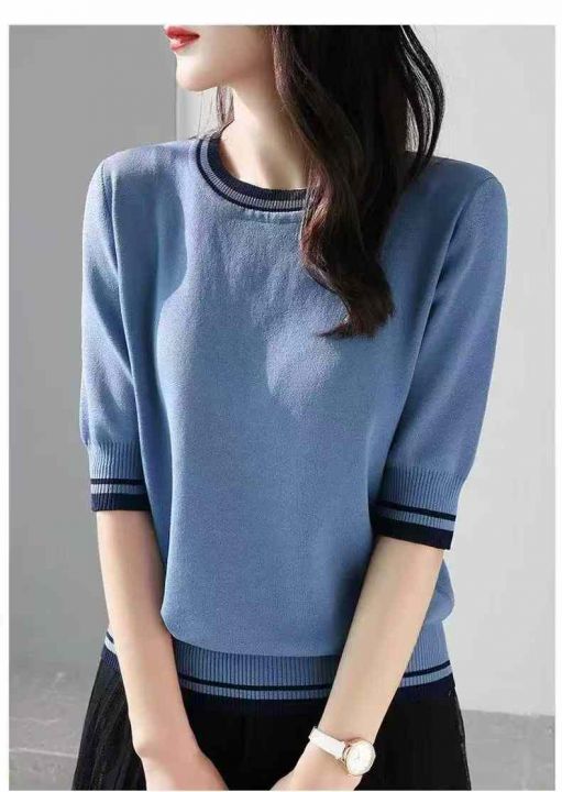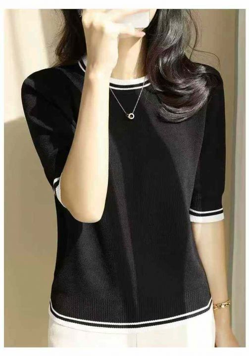 夏季新款日系圆领五分袖拼色冰丝针织T恤衫,独立包装...