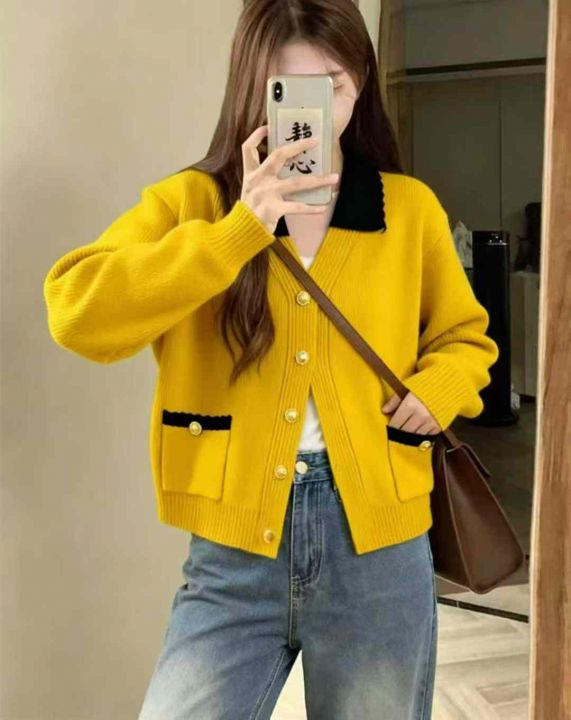 早秋新款小香风撞色翻领温柔风减龄百搭宽松显瘦毛衣开...