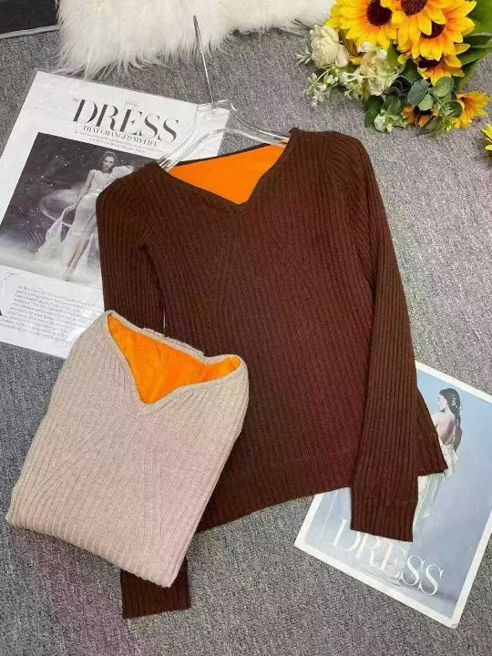 冬季新款加绒加厚美拉德色系V领坑条包芯纱套头毛衣,...