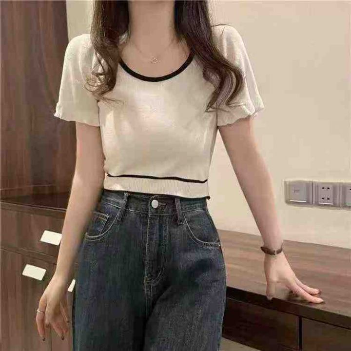 夏季新款高弹力方领木耳边法式奶系温柔风针织短袖T桖...