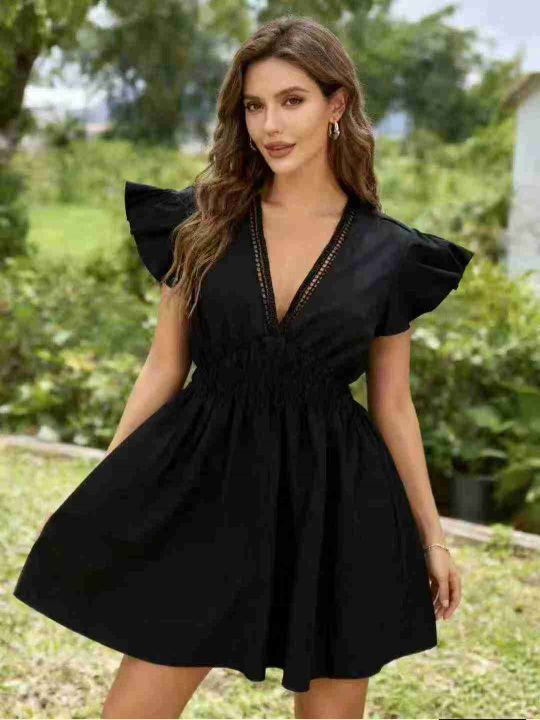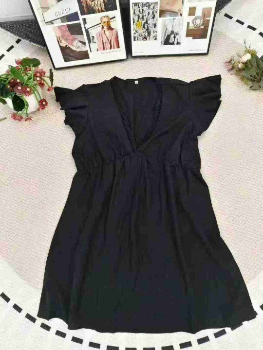 高级感法式荷叶摆袖收腰显瘦V领性感连衣裙 数量350件左右 尺码S--2XL 独立包装 货品干净整洁漂亮