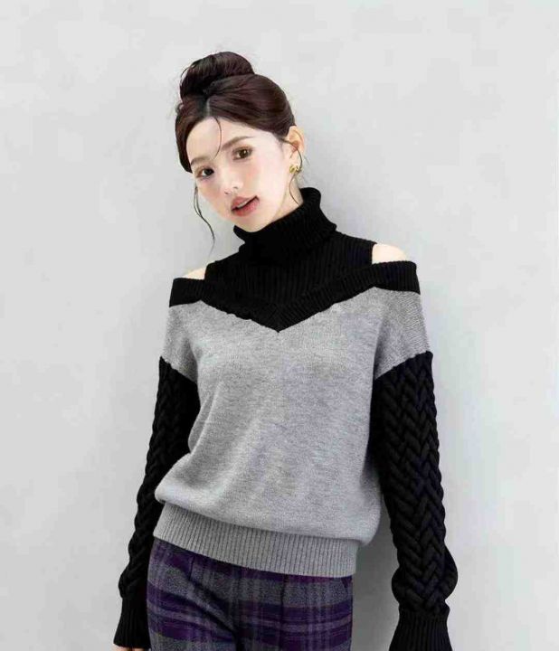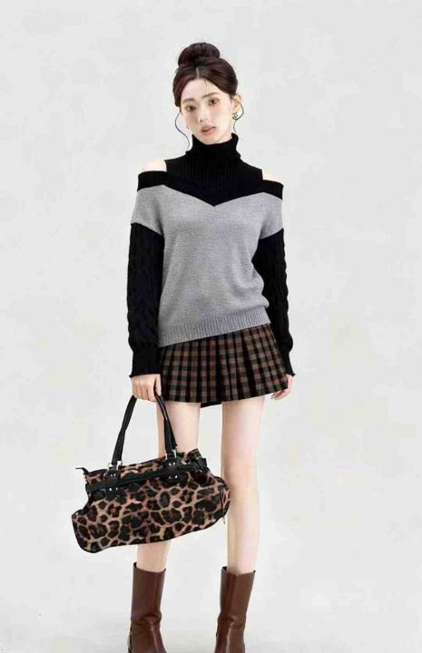 秋冬装新款慵懒风宽松撞色漏肩设计款小心机高领拼色套...