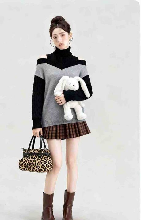 秋冬装新款慵懒风宽松撞色漏肩设计款小心机高领拼色套头毛衣,独立包装,面料软糯厚实,273件,全清5.9元超低价秒杀!模特上身效果可参考!