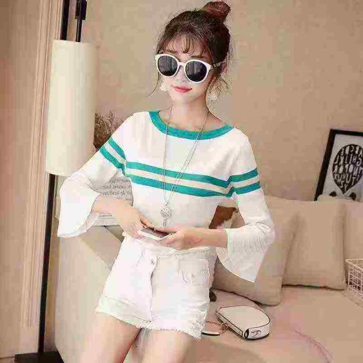 全清5.9 春秋新款女装时尚条纹冰丝针织衫,修身百搭喇叭袖,全部独立包...