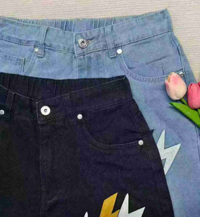 水洗棉直简微喇叭长裤松紧腰美式潮牌宽松闪电皮刺绣牛仔裤,488件,S-2XL,...