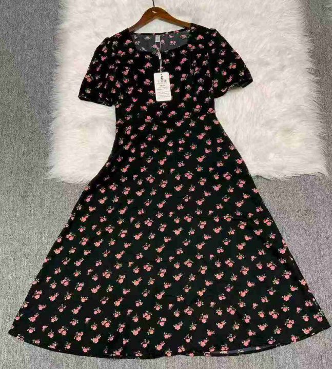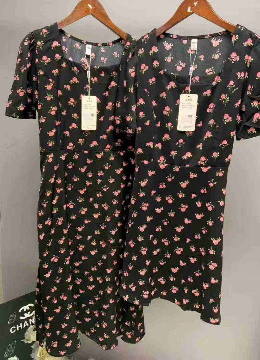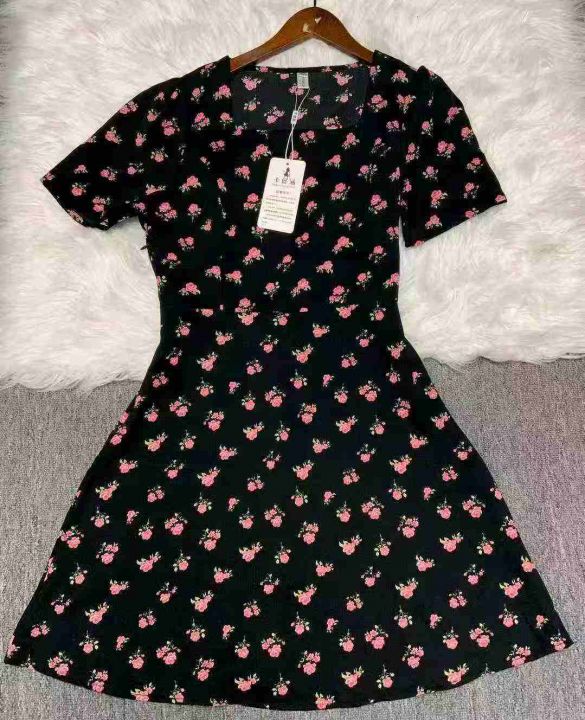 碎花裙女夏季新款女长款修身显瘦方领短袖小黑裙子法式收腰连衣裙260件,独立包装带吊牌,尺码S-3XL货品干净整洁,全清福利价12.8元