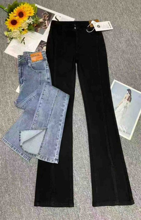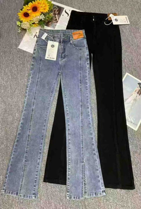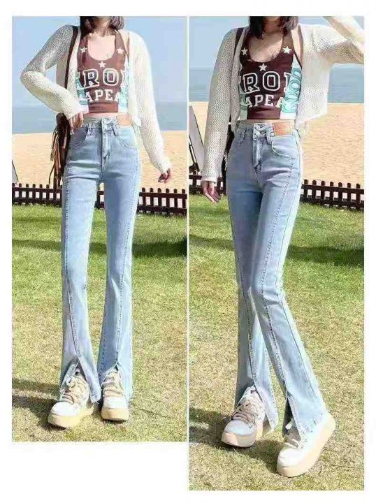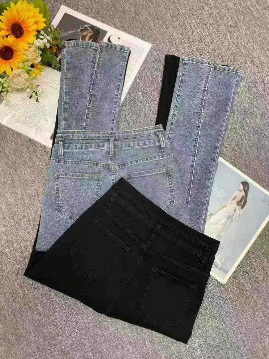 秋季新款高弹力洗水棉开叉高腰显瘦牛仔喇叭裤,独立包...