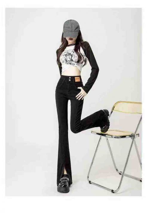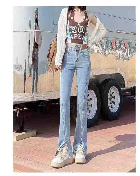 秋季新款高弹力洗水棉开叉高腰显瘦牛仔喇叭裤,独立包...