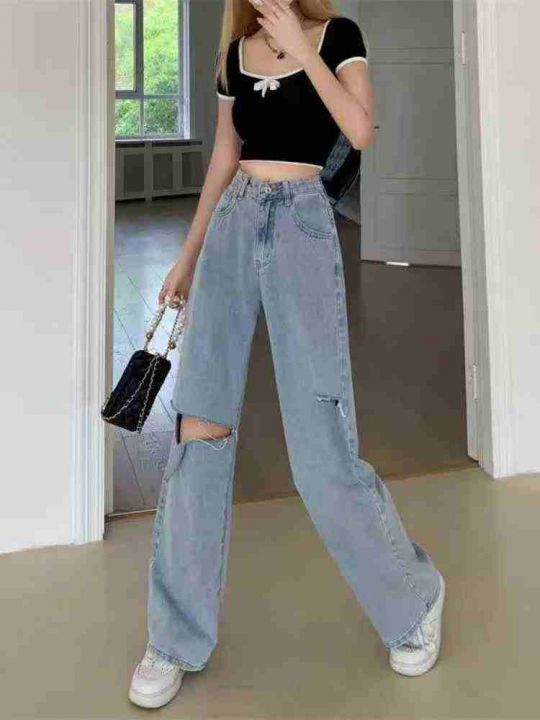 网络爆款高腰阔腿牛仔裤女泫雅风秋冬新款显瘦蓝色拖地牛仔直筒裤,品质手感...