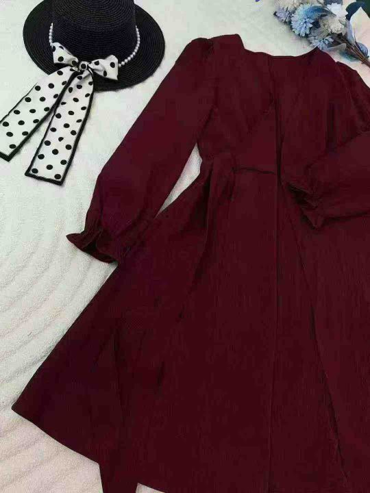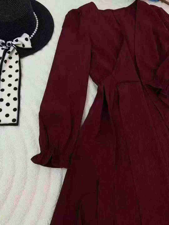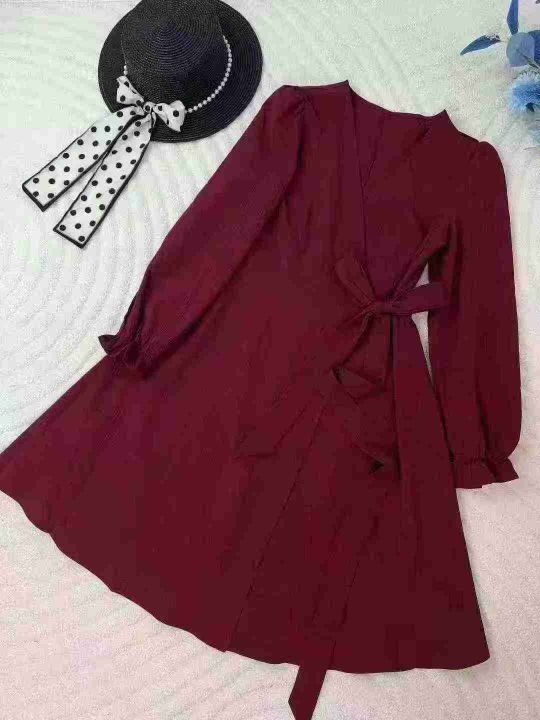 纯色裹胸款春秋季衩领束带灯笼袖长袖连衣裙