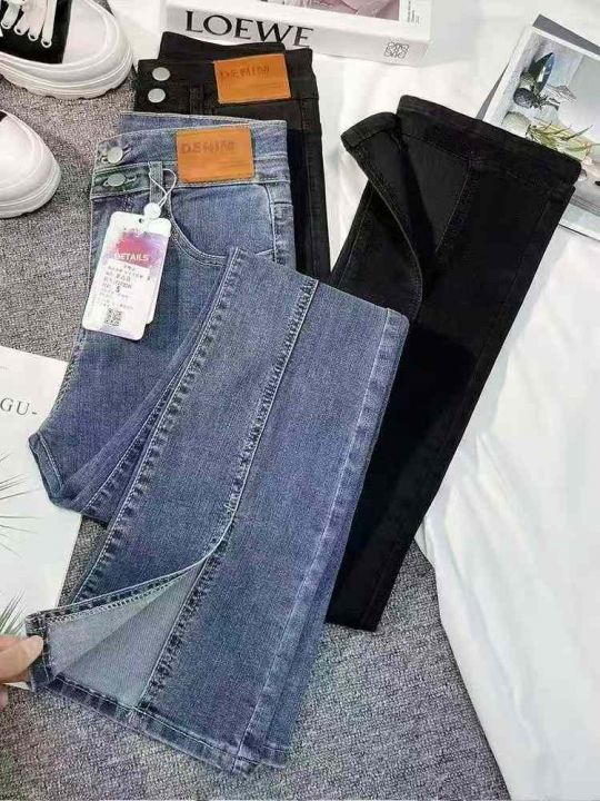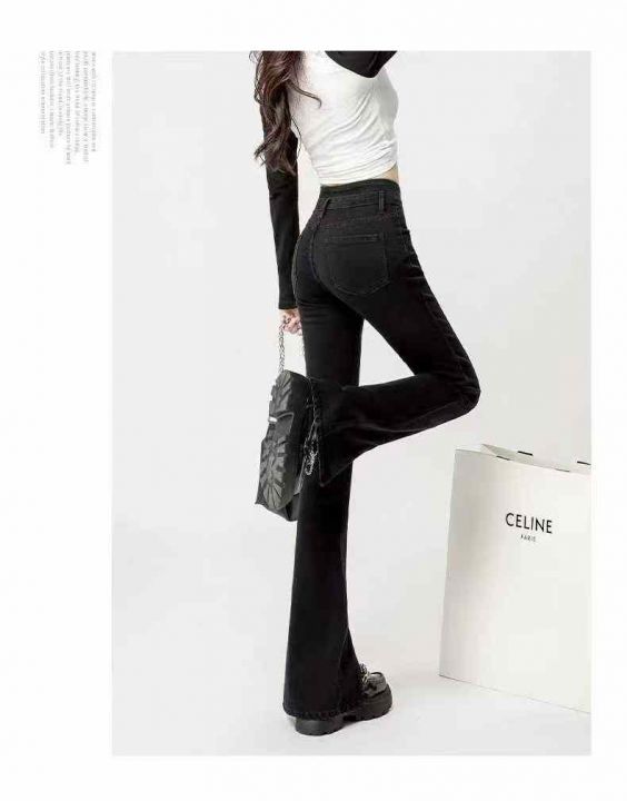 秋季新款高弹力洗水棉开叉高腰显瘦牛仔喇叭裤,独立包...