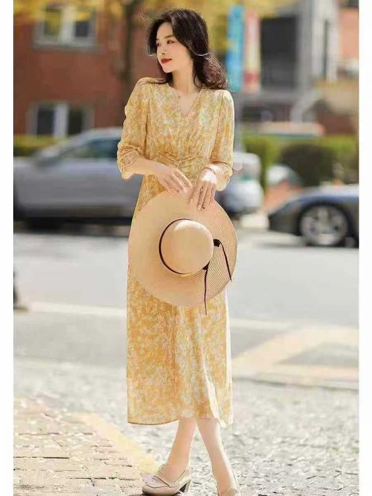整款连衣裙茶歇法式黄色V领碎花连衣裙女夏气质优雅温柔风修身收腰长裙144件...