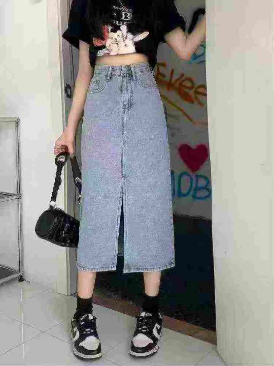 靓妹款半身裙 春秋爆款 高腰显瘦前开叉a字包臀牛仔中...