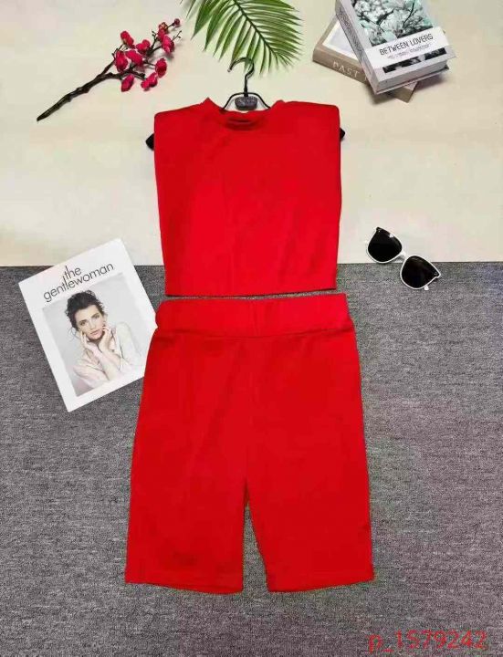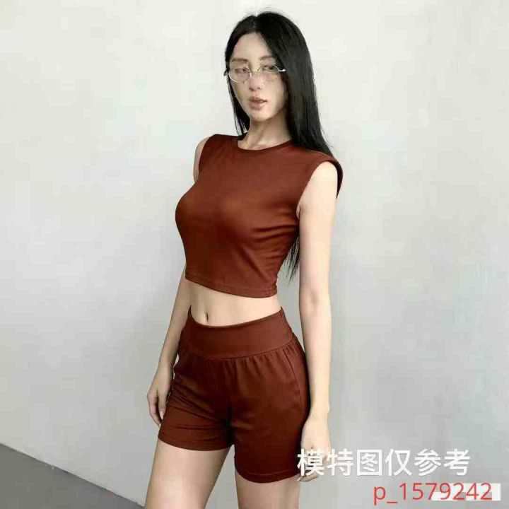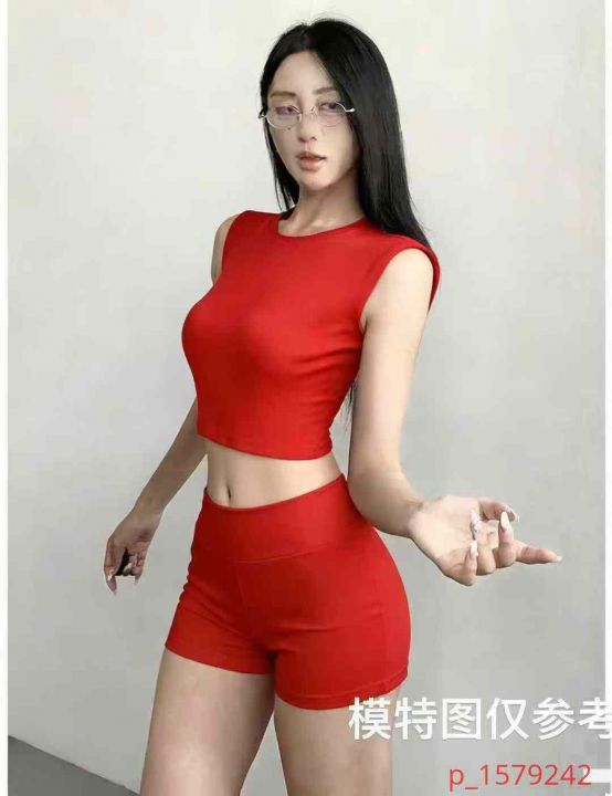 时尚显瘦肩垫无袖上衣加紧身短裤两件套,整款四色,数量196套,码数S-2XL,高弹力,品质好,有独立包装。 _@_@