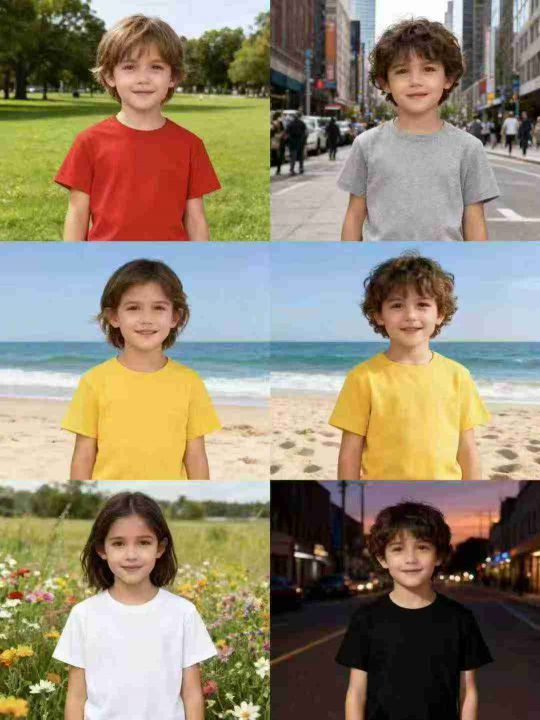 纯棉童装短袖T恤,数量6330件,尺码110--160,有十几个颜色,后领包边到肩,没包边的有111件,十件一包装,有码数清单,大货干净整洁