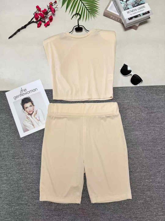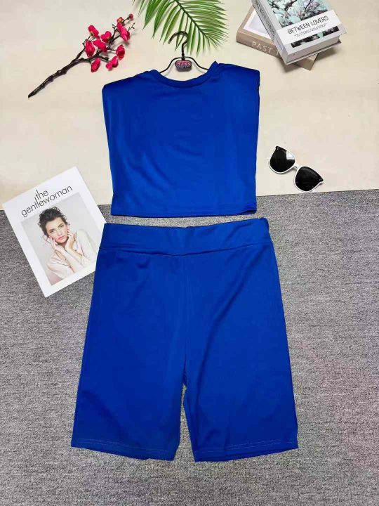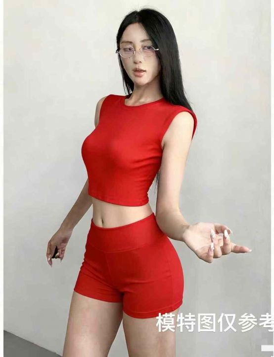 时尚显瘦肩垫无袖上衣加紧身短裤两件套,整款四色,数量196套,码数S-2XL,高弹力,品质好,有独立包装。