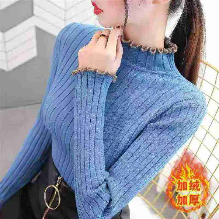 加绒加厚秋冬新款木耳边半高领内搭毛衣女套头修身显瘦...