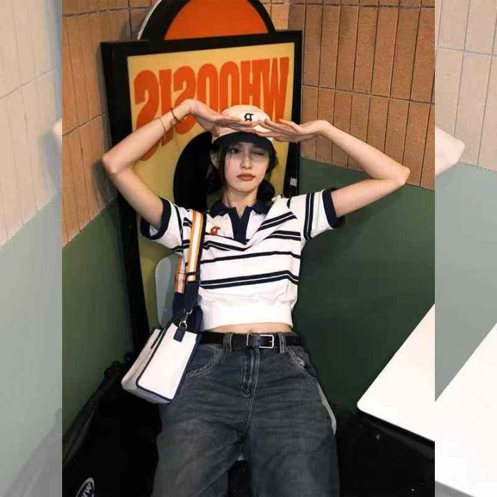 全清价5.9元正肩短袖t恤女短款辣妹小众条纹翻领polo衫...