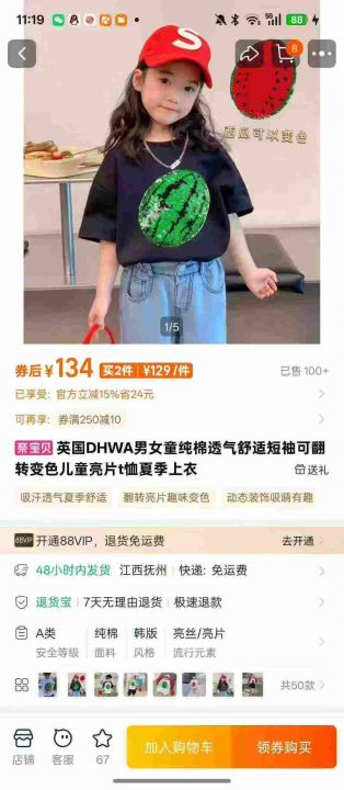 工艺款,儿童纯棉翻转亮片变色短袖t恤数量:19200件,码数:(1-6)100-118-1...