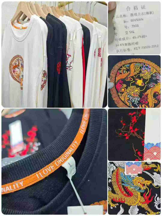 实体供应链回收3400件国风纯棉潮牌重工重磅刺绣圆领舒卫衣,码数S-5XL。面料柔软舒适,黑白色系为主,万针刺绣工艺,高克重面料,中山货做工非常好,全部独立包装!分货➕1