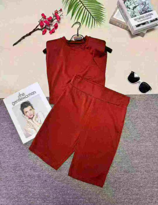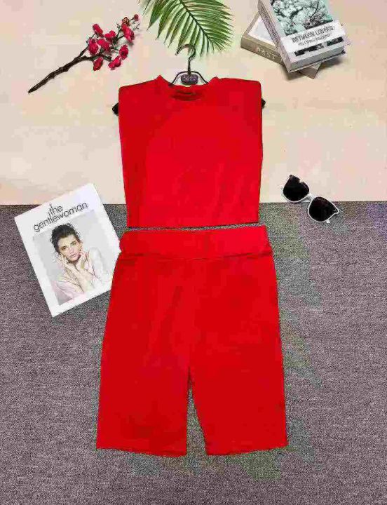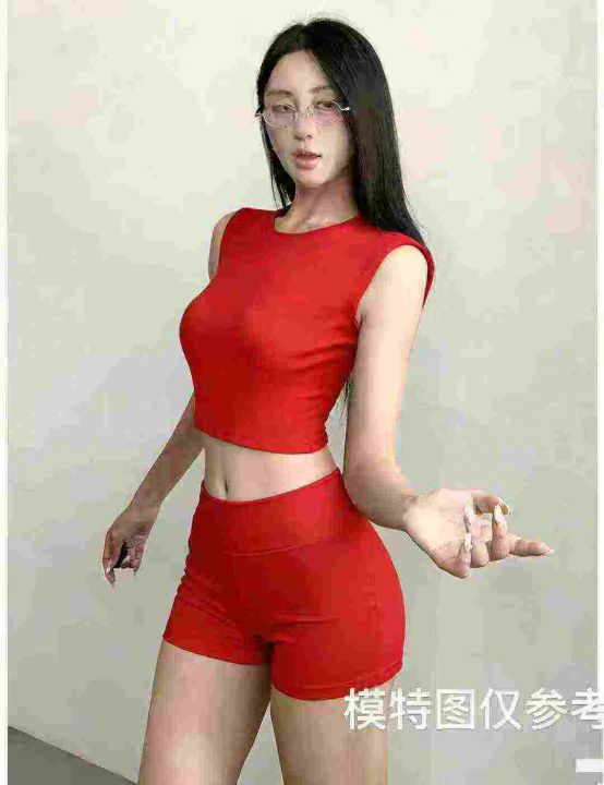 时尚显瘦肩垫无袖上衣加紧身短裤两件套,整款四色,数量196套,码数S-2XL,高弹力,品质好,有独立包装。