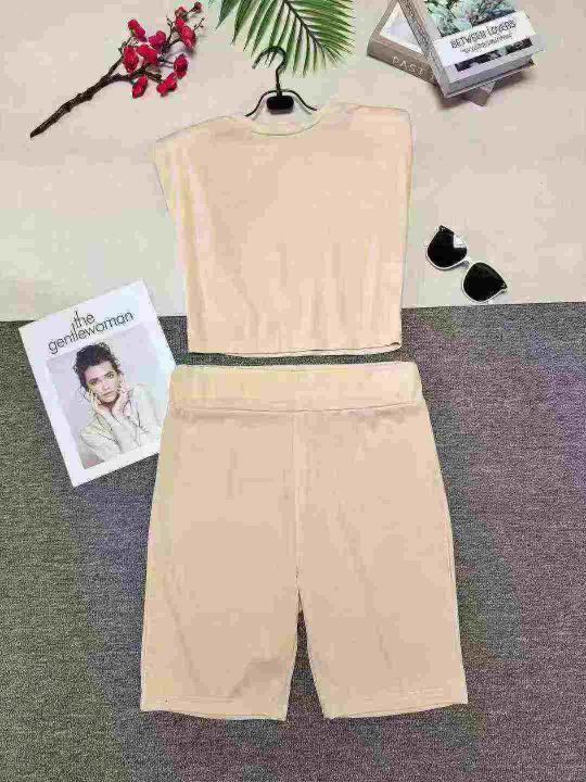 7.5清时尚显瘦肩垫无袖上衣加紧身短裤两件套,整款四...
