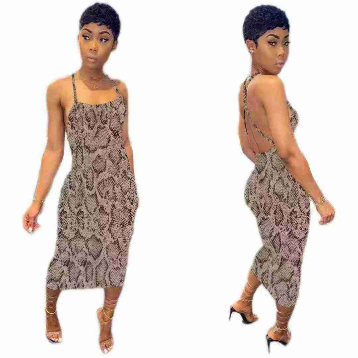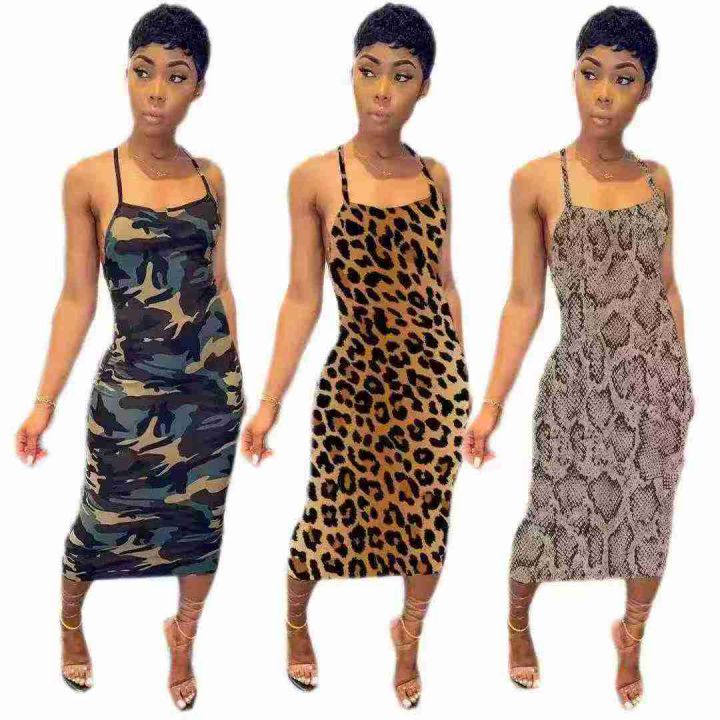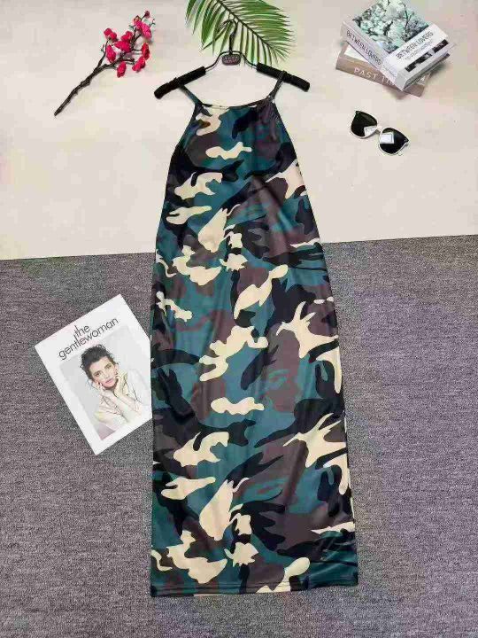 时尚三色印花性感吊带露背斑纹迷彩连衣裙,整款多色,数量300条左右,码数S-2XL,高弹力,品质好,有独立包装。