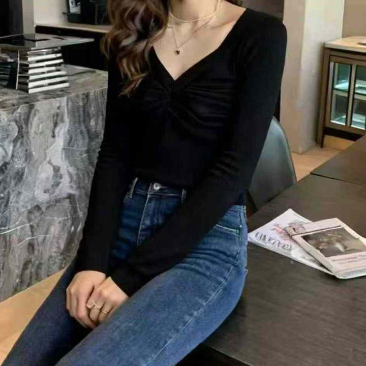 秋季新款弹力修身显瘦V领褶皱套头毛衣,独立包装,单...