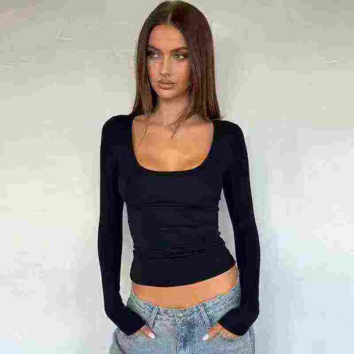 5851件,女早秋季纯色百搭U领长袖T恤上衣女弹力修身高腰显瘦打底衫,一包3...