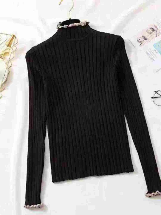 加绒加厚秋冬新款木耳边半高领内搭毛衣女套头修身显瘦...
